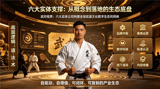 武印视界背后是六大实体公司共同构建的全球武道文化数字生态共同体。以“道·法·术”为底层逻辑,品牌中枢、赛事运营、数字科技、标准认证、线下道场、内容传播六大板块一体共生,形成自驱动、自增值、可闭环、可复制的产业生态。每一场盛典、每一个体验、每一枚印记,都有坚实的商业底盘与运营主体做支撑。